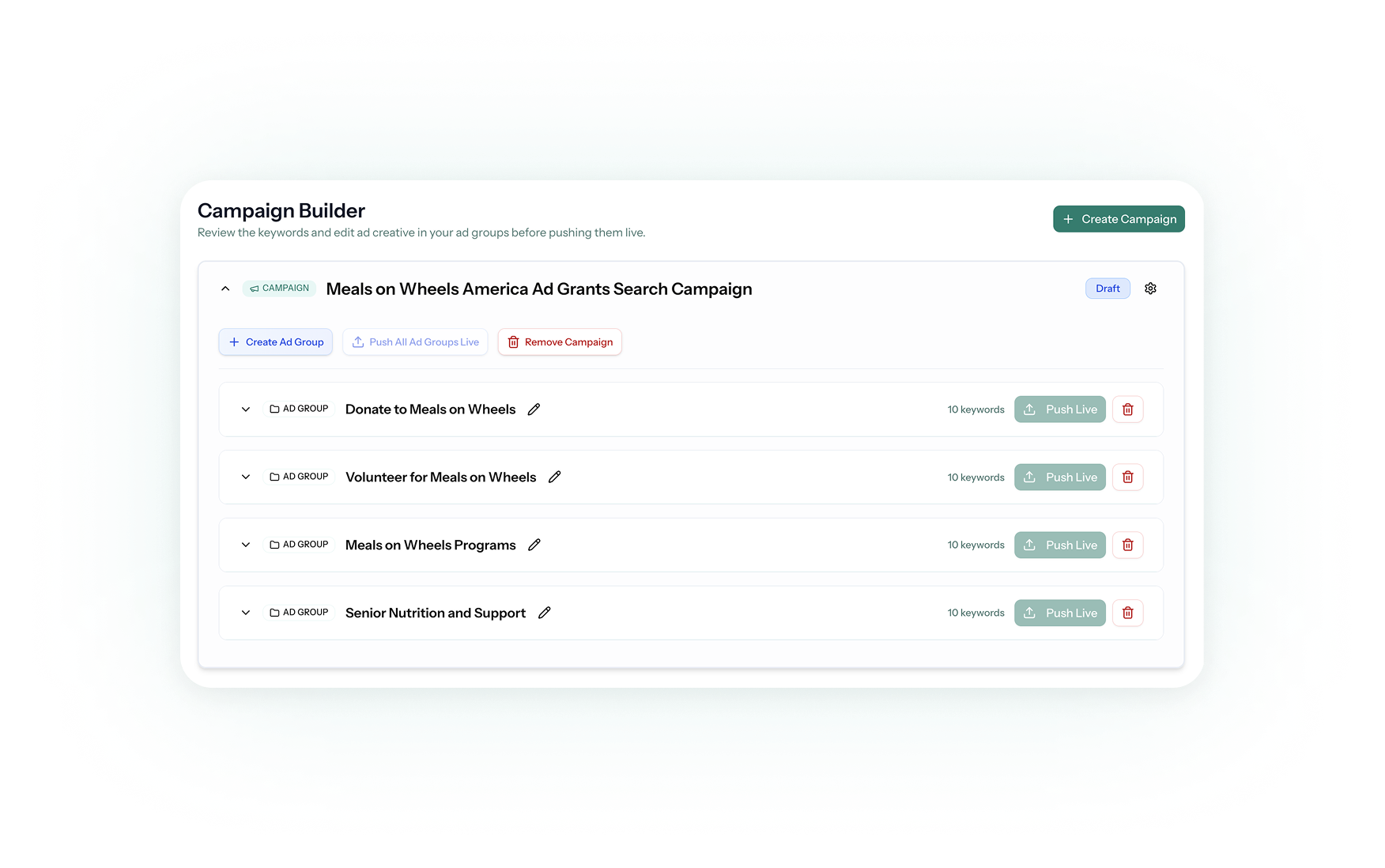 Your first search campaigns are built by the time you login. Connect your Ad Grants account and launch!